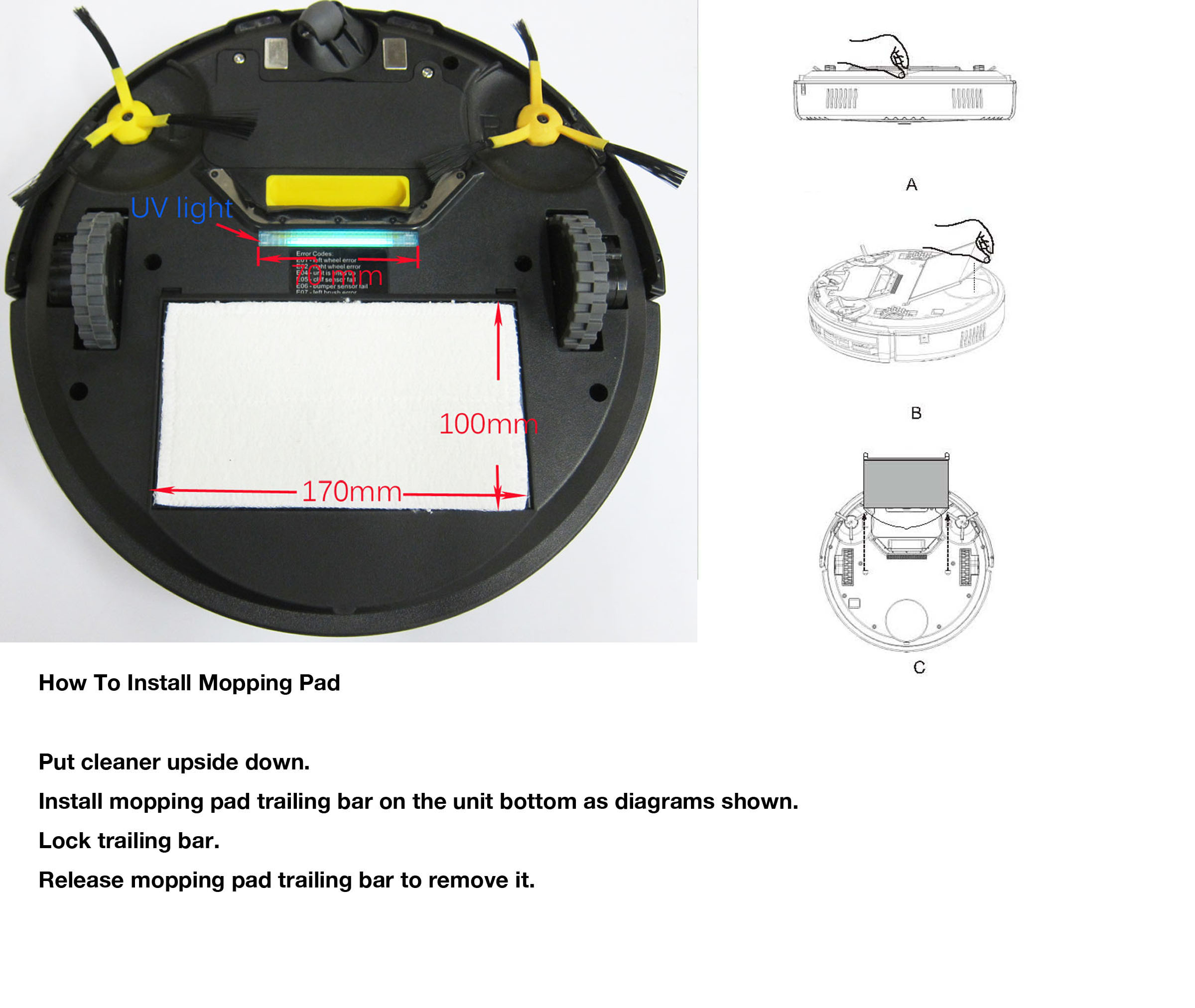 4. Will Hovo 620 continue to do vacuuming after battery is recharged?  No. but after the battery is completely recharged by its docking station, you can press the "CLEAN" key to resume cleaning. To save power consumption, you can turn power switch off after battery is fully charged. 5. Can Hovo 620 mop the floor? Hovo 620 model has two extra features; UV light to kill germs and mopping pad to mop hard surface floors. Two washable microfiber mopping pads are included inside package to do dry or wet mopping. You can also use third party Kirkland Scotch Brite ™or Swiffer Sweeper™ pads to perform your mopping or sweep floor cleaning. It is easy to mount third party pad on mopping trailing bar. See photos below:     6. Should Hovo 620 remain at charging base in order for scheduler to work? No, Hovo 620 scheduler can function anywhere. When pre-programmed time arrives, Hovo 620 will automatically start the cleaning process. 7. What is the warranty period for Hovo 620?         8. Where can I get Hovo 620 User Manual? 9. Does Hovo 620 have virtual wall like device to block vacuuming area?