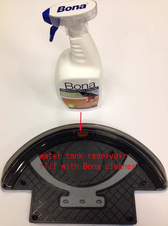 The mop pad can be dry or wet. You can fill water tank reservoir with tap water or cleaning solution like Bona® Hardwood Floor Cleaner. Water or cleaning solution inside reservoir will continue to seep out onto the mopping cloth slowly. It works like Pro-Clean reservoir of iRobot® Braava™ floor mopping robot.